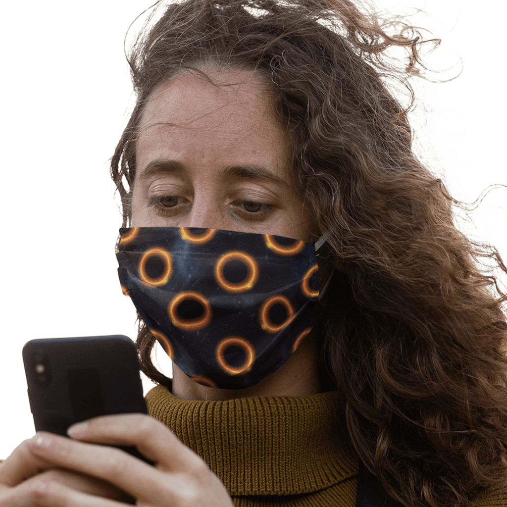 65 MCMLXV Black Solar Eclipse Polka Dot Pattern Face Mask. 7 Layers Face Mask comes with 5 layer PM2.5 Activated Carbon Filter and 5 pack of self adhesive nose crimps. You can also remove the carbon filter and use as mask cover.